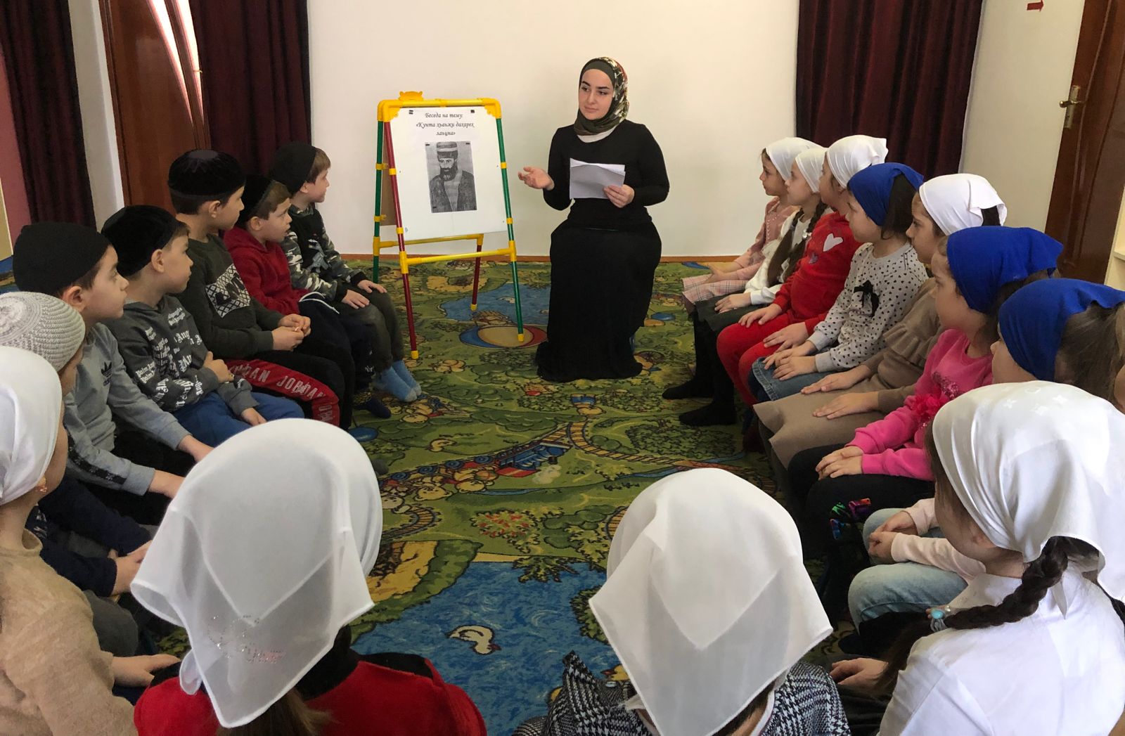 03.02.2022Педагог дополнительного образования Хачукаева Румиса Алиевна проведа беседу с воспитанниками ДОУ посвященную дню памяти и почитания Устаза Кунта Хажи Кишиева (да будет возвышена его святость) Из ее рассказа дети узнали о всей жизни этого святого человека, который праповедывал смирение, мир, доброту и справедливость. Румиса Алиевна говорила о том, что благодаря Всевышнему, уже который год мы имеем возможность чтить память о Великом Шейхе. Наши Святые Эвлия несмотря на все потрясения, которые пережили, сохранили свое лицо и честь благодаря искренней вере и любви к Всевышнему. А своим личным примером и великой мудростью данной свыше, укрепили ее в сердцах людей.